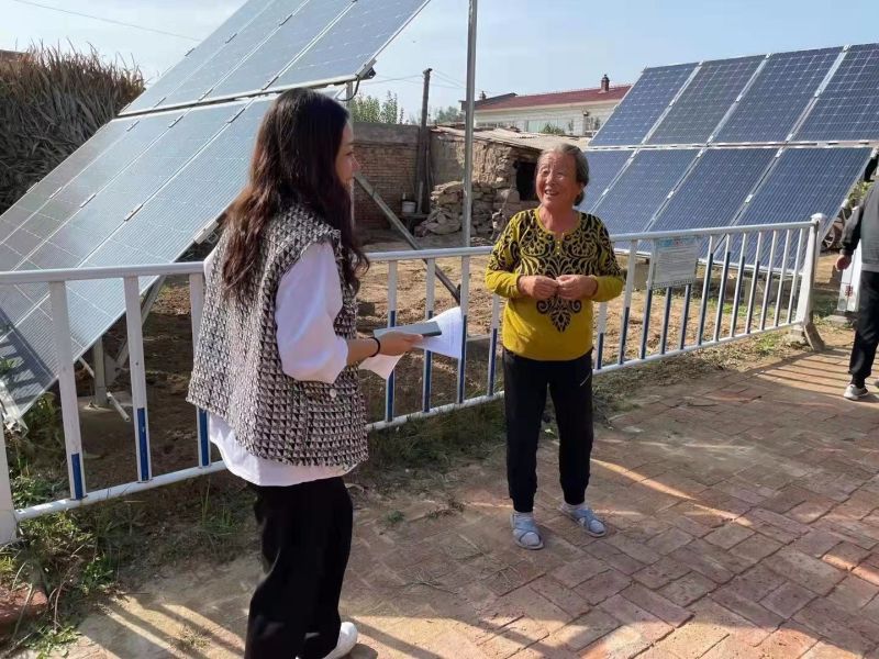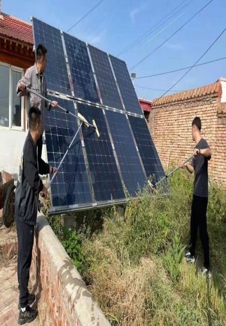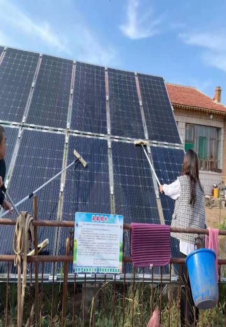“機關(guān)黨支部每4名黨員+澤霖黨支部1名技術(shù)維護黨員”組成包聯(lián)小組赴沙爾沁老龍不浪村光伏扶貧分布式發(fā)電項目的26戶貧困戶家中,進(jìn)行光伏板的運維及清洗。