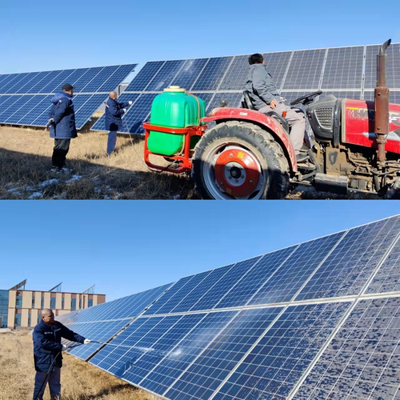 光伏電站在運行過程中,因自然環(huán)境及周圍環(huán)境對光伏組件表面造成污染,使得透光率降低,是導(dǎo)致系統(tǒng)發(fā)電效率降低的重要原因之一。外加今年冬季降雪少,灰塵堆積嚴重,發(fā)電效率明顯下降。針對以上情況,澤霖公司根據(jù)冬季實際情況認真部署、周密策劃,在明確各項清洗作業(yè)要求及安全注意事項前提下,分時段、分區(qū)域、分小組對廠區(qū)各方陣開展清洗工作。