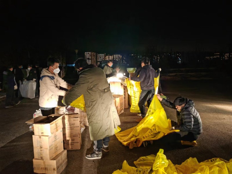 圖為曲波深夜帶領集團工作人員為隔離人員發(fā)放生活物資